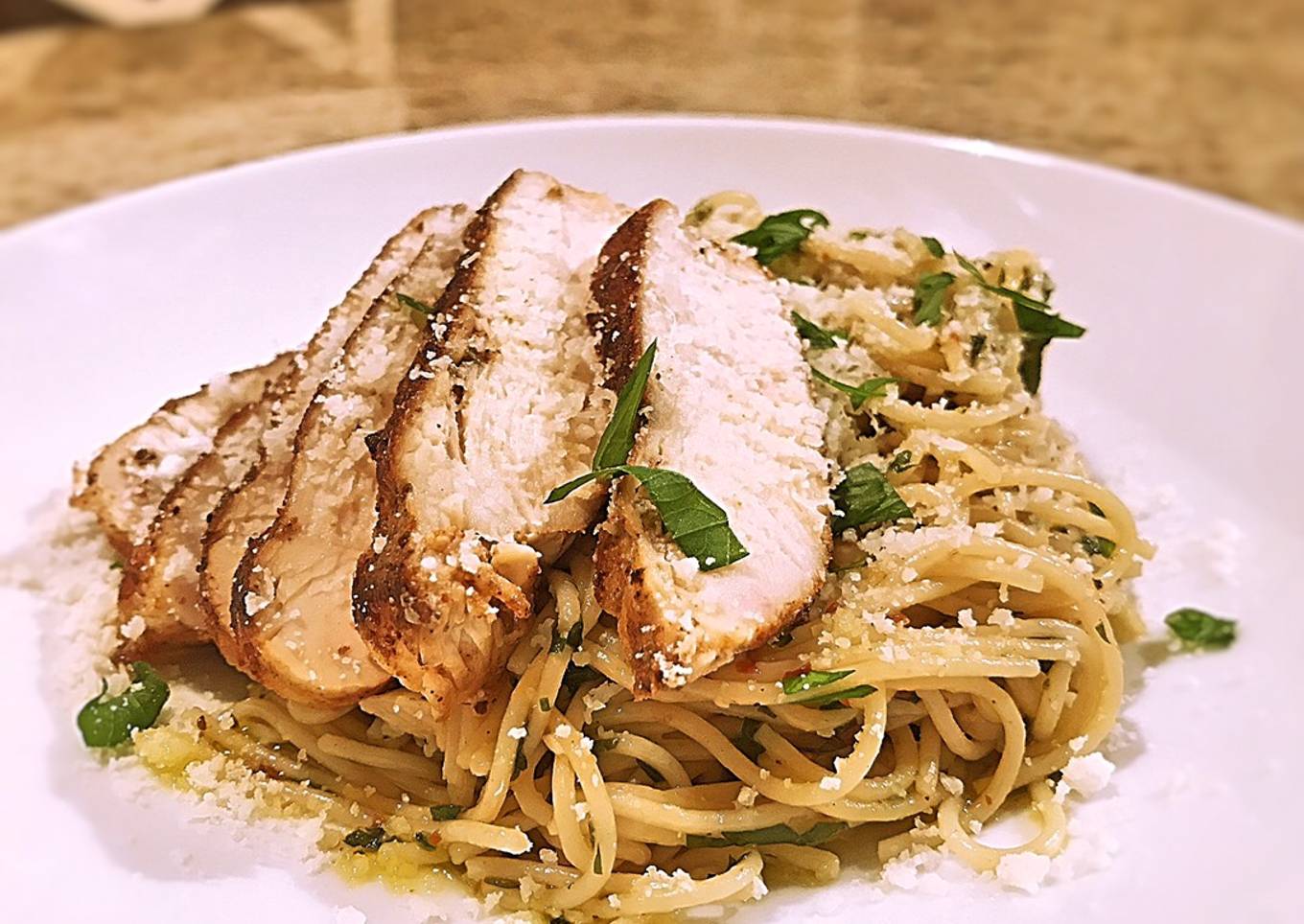 Aglio e Olio with blackened chicken