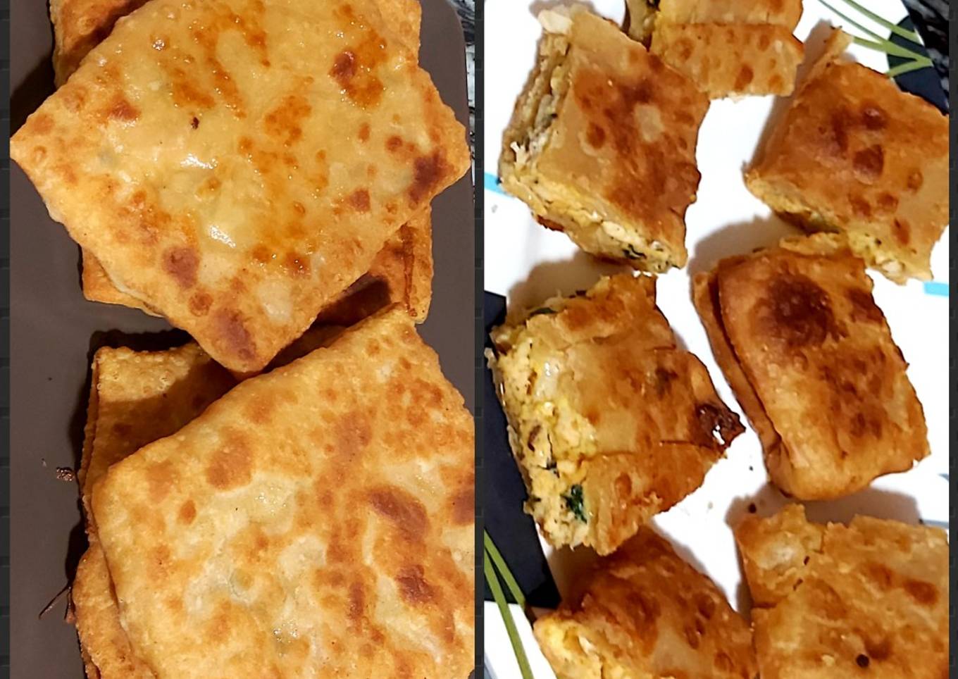 - Make a dough by adding wheat flour,salt,oil and water...make big balls of it..roll it into chapati shape..keep the egg chicken stuffing in between and fold from all four size