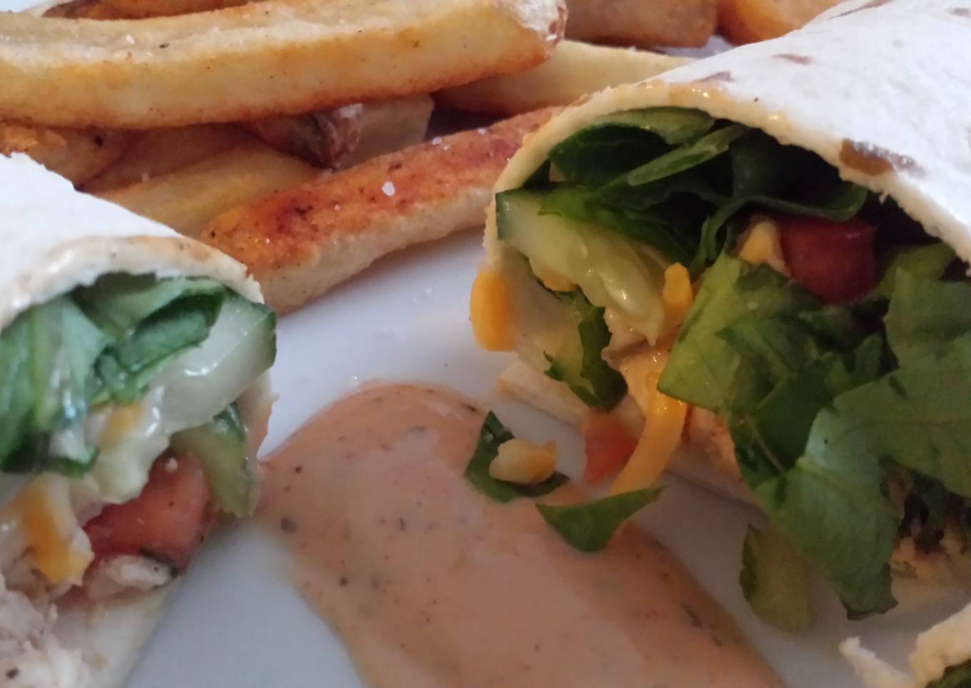 - Remove chicken from heat, and cut into 1/2" strips. Place on tortilla, wrap with both ends closed, and chop in half. Arrange wraps, and drizzle 2 tbsp chipotle ranch on plate for dip.