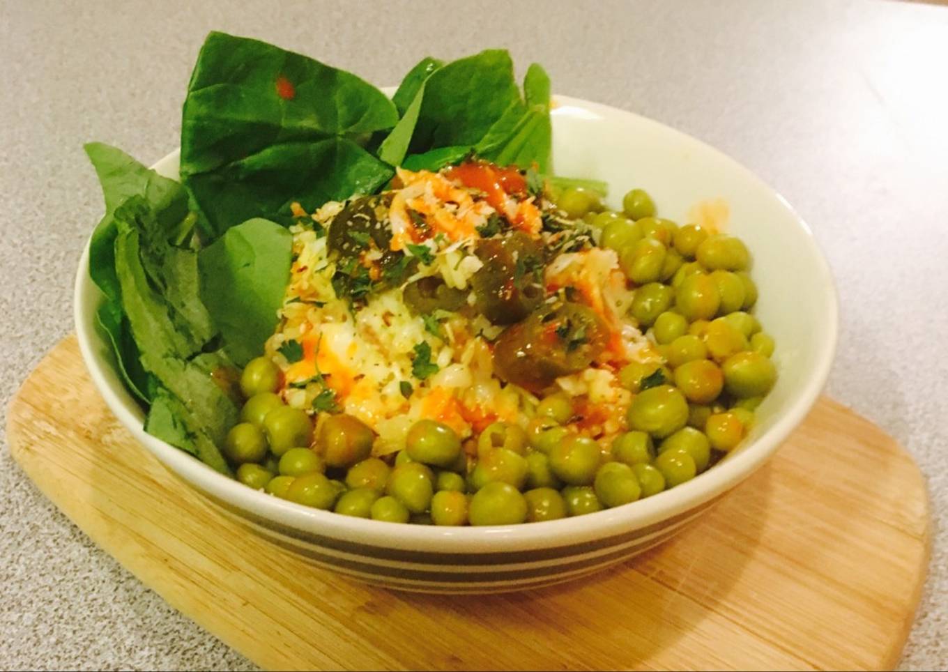 - Lastly, place a 1/2 cup of the chicken and rice atop the vegetables. For added taste top with parmesan cheese.