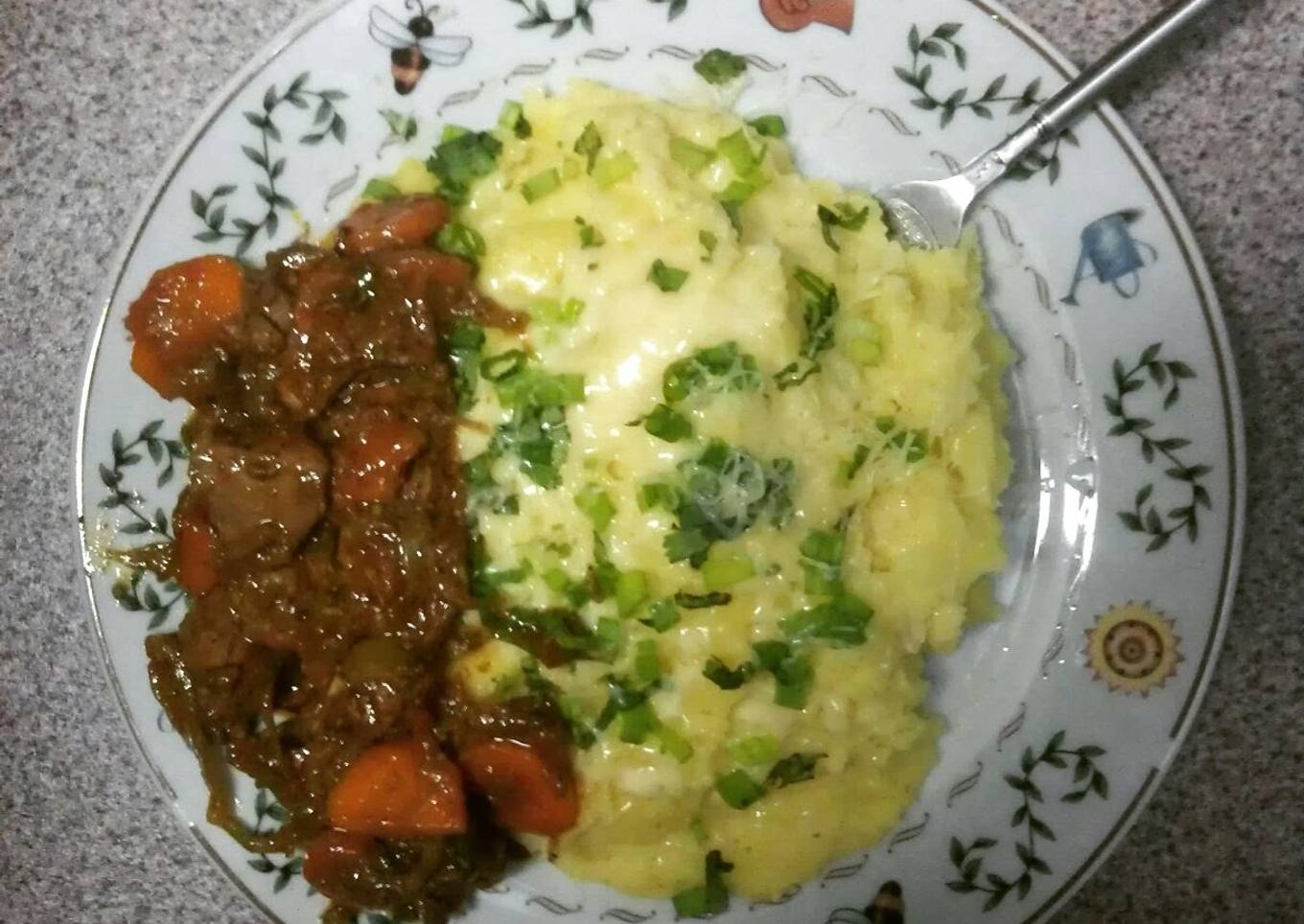 cheesed mash potatoes topped with spring onions & chicken liver stew