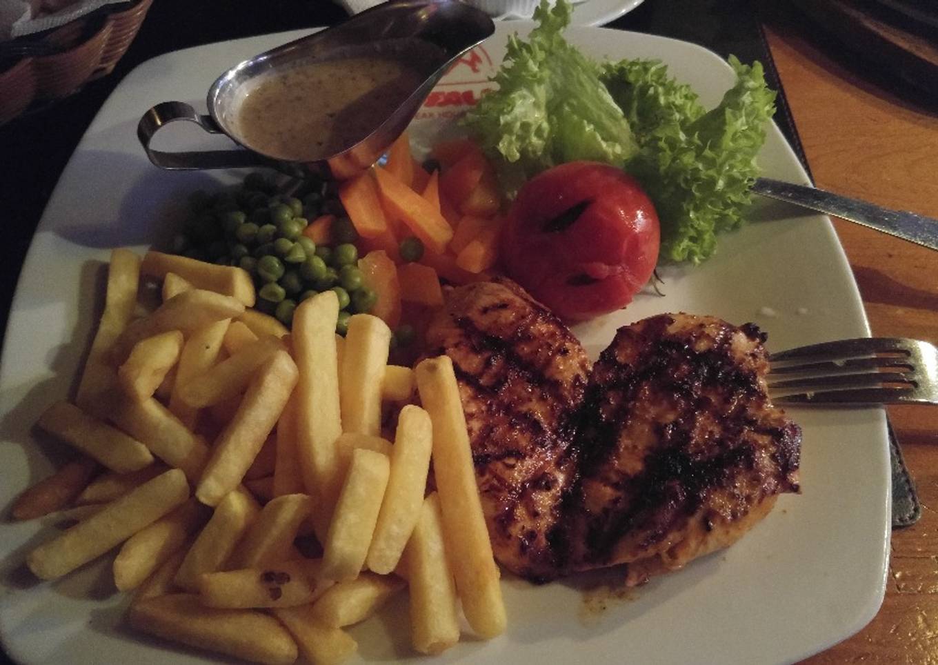 - We serve the chicken breast with french fries, sauteed vegetables and garlic sauce