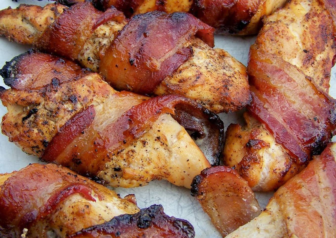 - Coat your dish with nonstick cooking spray Cut each breast into 3 pieces, season all the chicken with the spices, then wrap a bacon slice around each piece, put the chicken in the dish and cover with brown sugar.